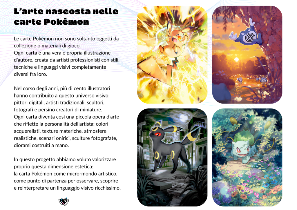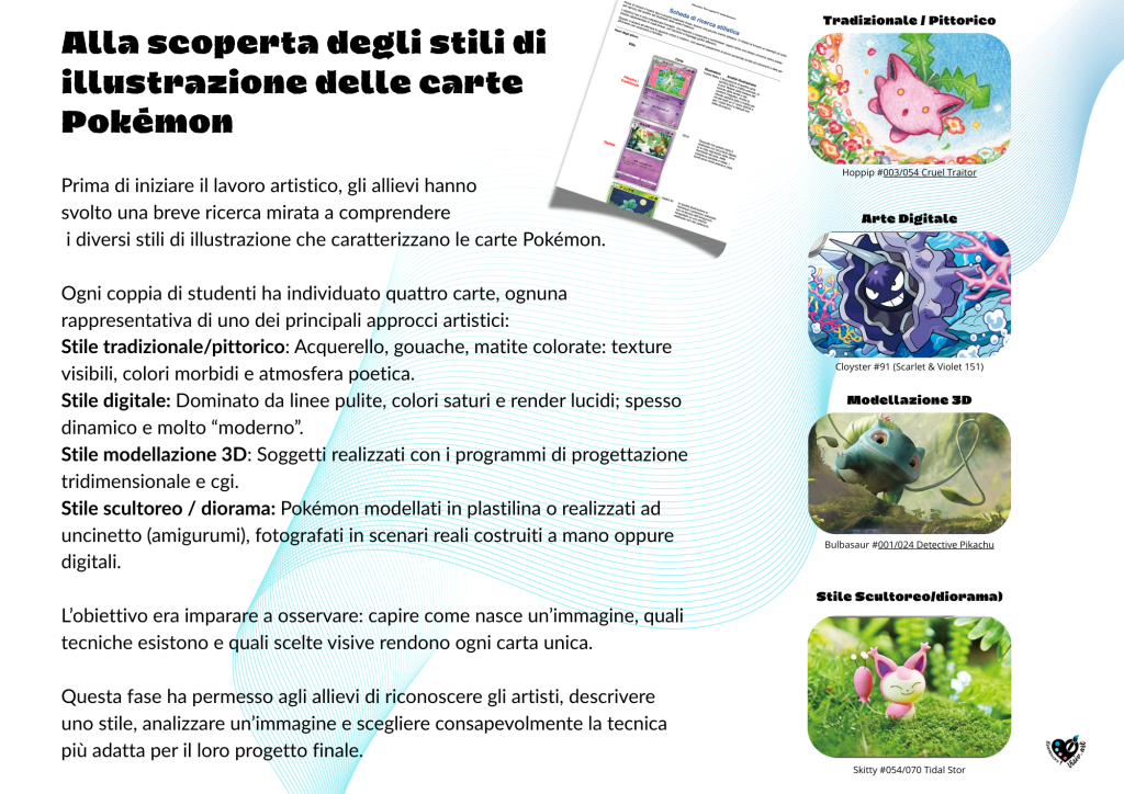 Gli allievi dell’opzione educazione visiva di quarta media della prof.ssa Buonocore hanno partecipato a un percorso dedicato allo studio dell’illustrazione nelle carte Pokémon, un ambito artistico sorprendentemente ricco e sofisticato. Attraverso un’analisi approfondita degli stili dei principali illustratori ufficiali, dalle linee pulite e digitali dei 5ban Graphics alle atmosfere pittoriche di Mitsuhiro Arita, gli studenti hanno esplorato tecniche, cromie, texture e scelte compositive caratteristiche di questo universo visivo.