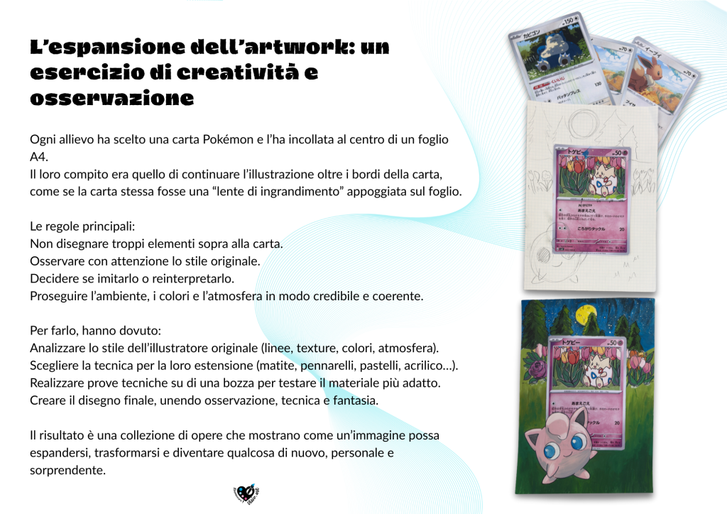 Dopo la fase di ricerca, ogni allievo ha scelto una carta Pokémon e ha “esteso” l’illustrazione originale, creando un disegno che si integra perfettamente con lo stile dell’artista di riferimento. Il risultato è una serie di opere sorprendenti, che uniscono osservazione, abilità tecnica e creatività, mostrando quanto il mondo delle carte collezionabili possa essere, a tutti gli effetti, un luogo di autentica espressione artistica.